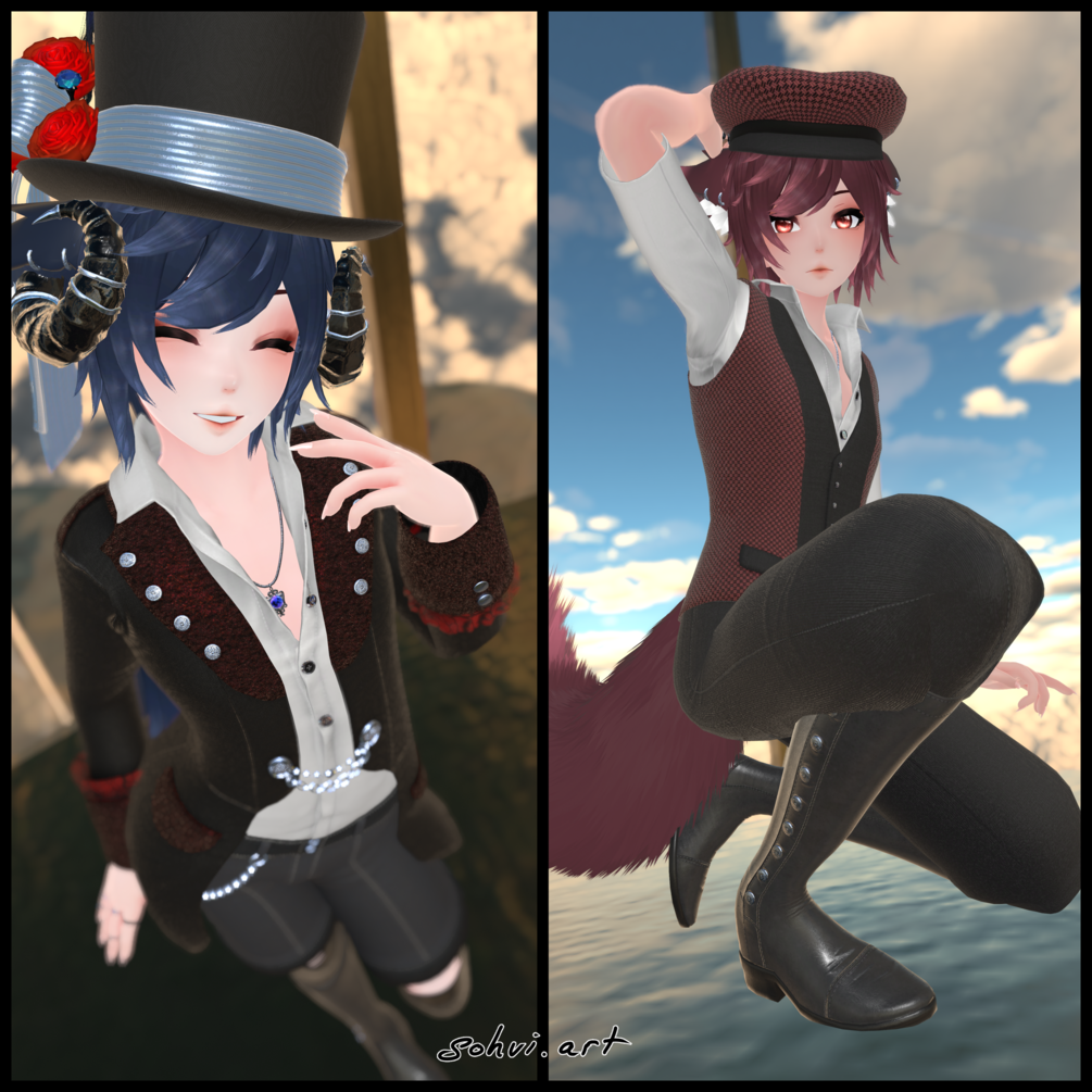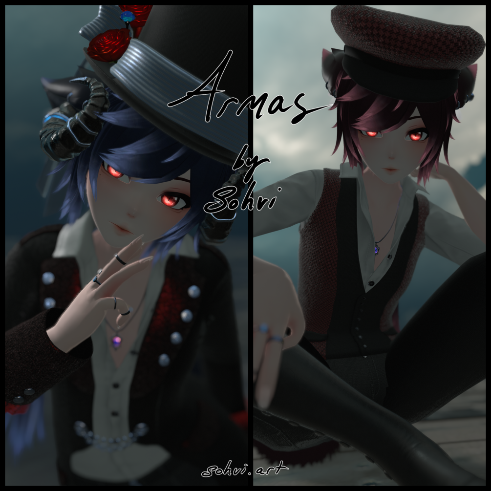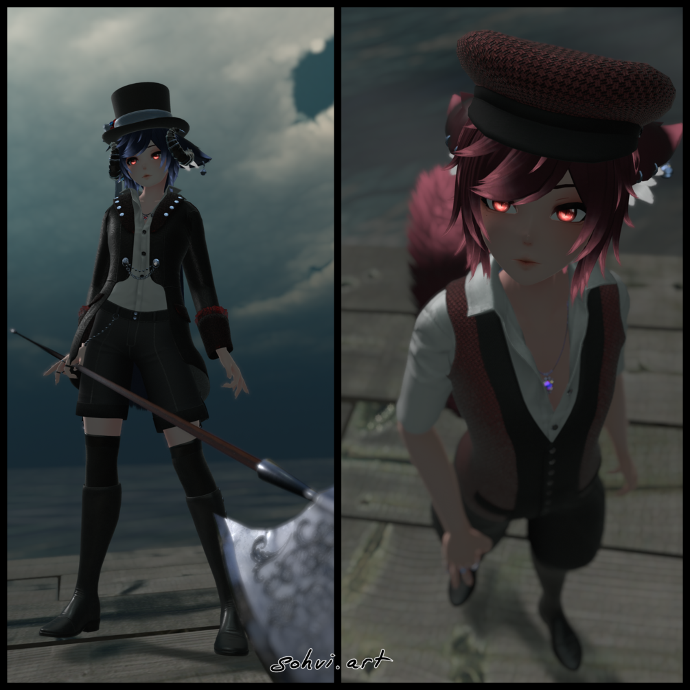 AFK, crouch and prone animations, Halberd axe, Trousers with suspenders, Shorts, Waistcoat, Tailcoat, Horns, Top hat and all of its accessories, Cap, Necklace, Socks with suspenders, Boxers, Boots, Piercings, All bell accessories, Eye Texture, Particles, Menu icons by me (sohvi.art/ Sohvi#9443) in Blender, Substance Painter and Clip studio paint. All images used are clip studio brushes or hand painted.
