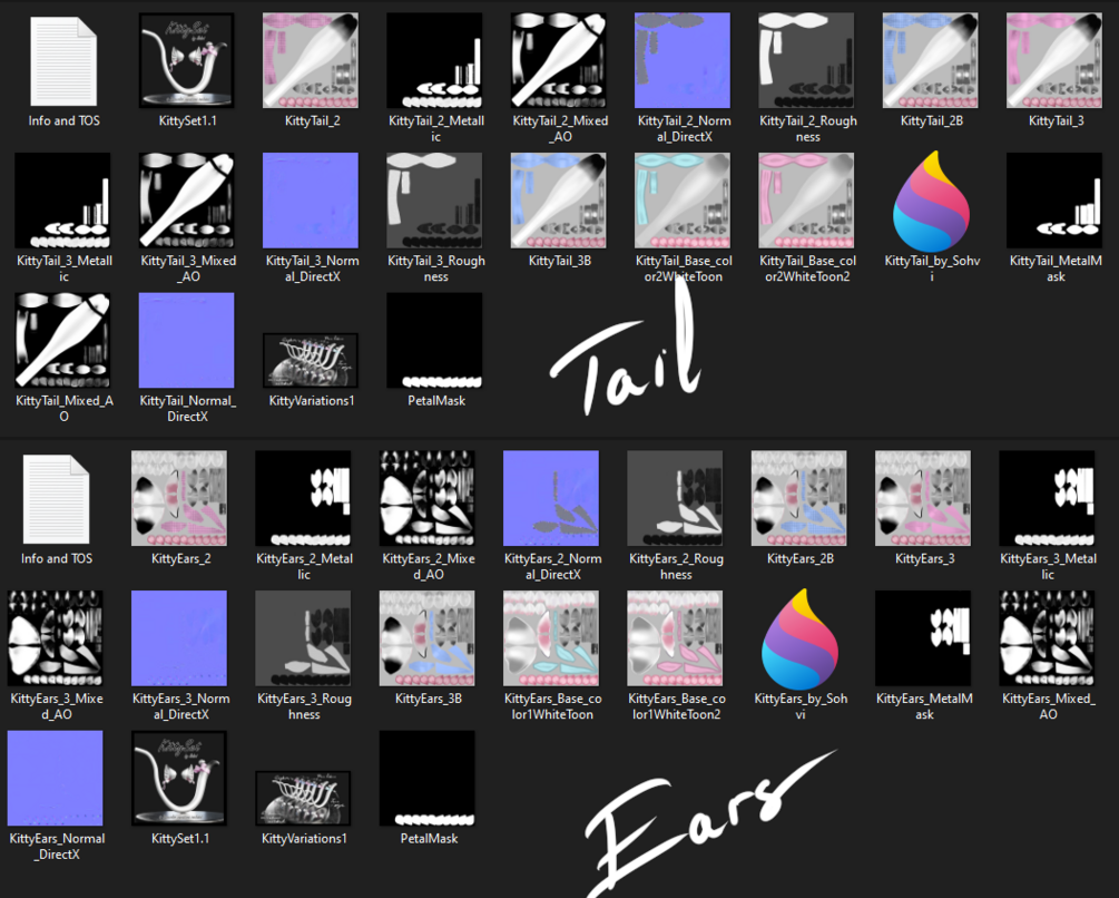 ⇢ 4K Textures, PBR maps (3 sets: Mixed AO, Roughness, Metallic, Normal ), 6 base textures: Gingham (pink, blue), normal fabric in realistic style (pink, blue) and then more booth/toon style texture (pink, blue). Toon style textures has fully white tail.