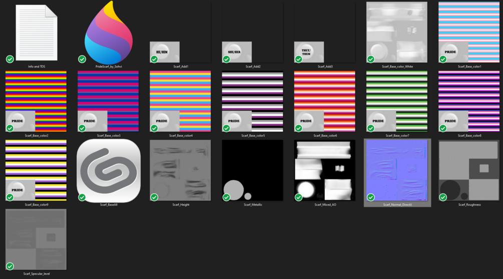 ⇢ 4K PBR textures (normal, AO, metallic, Roughness). 9 Different flag textures (rainbow, trans, ace, aro, pan, bi, lesbian, non-binary, genderfluid) with PRIDE pin. Also includes 3 pronoun copy/paste texture add-ons for the pin (you have to use some kind of picture editing program). Includes one layered PSD file for easy editing, otherwise PNG files.