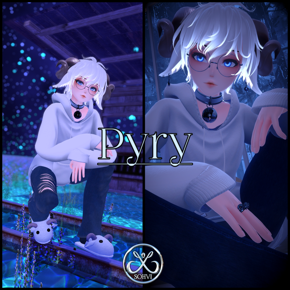 Custom AFK, crouch and prone animations, All clothes and footwear, Hair, Animal parts, Scarf, Earrings, Glasses, Ring, Bed, Sheep, Freckle textures, Eye Texture, Particles, Menu icons by me (sohvi.art/ Sohvi#9443) in Blender, Substance Painter and Clip studio paint. All images used are clip studio brushes or hand painted.
