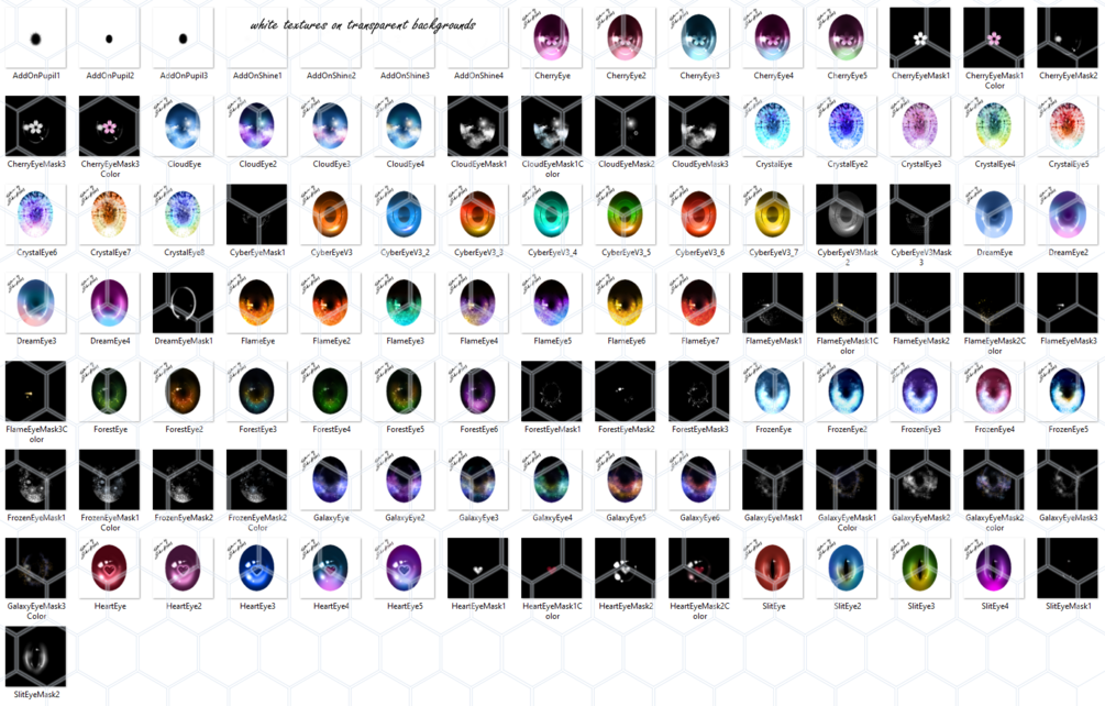 -11 different handpainted desings, made in Clip Studio Paint: Cherry eye, Cloud eye, Chrystal eye, Cyber eye, Dream eye, Flame eye, Forest eye, Frozen eye, Galaxy eye, Heart eye and Slit eye